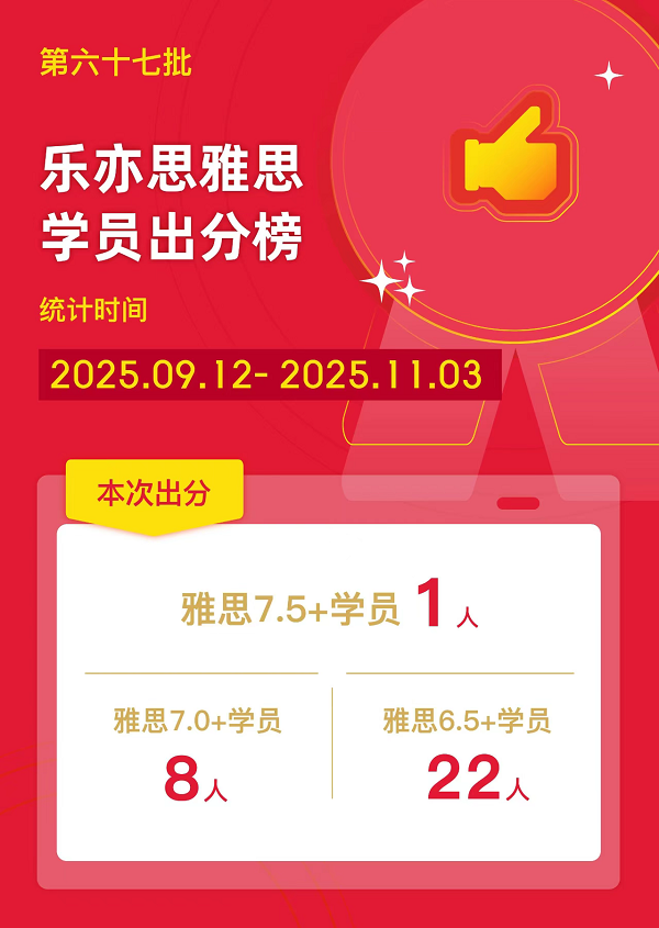 最近,樂亦思雅思又傳捷報啦!第67批學員出分情況令人眼前一亮,眾多學員成功斬獲理想分數(shù),這也為他們之后的留學道路打好基礎,再次恭喜他們!